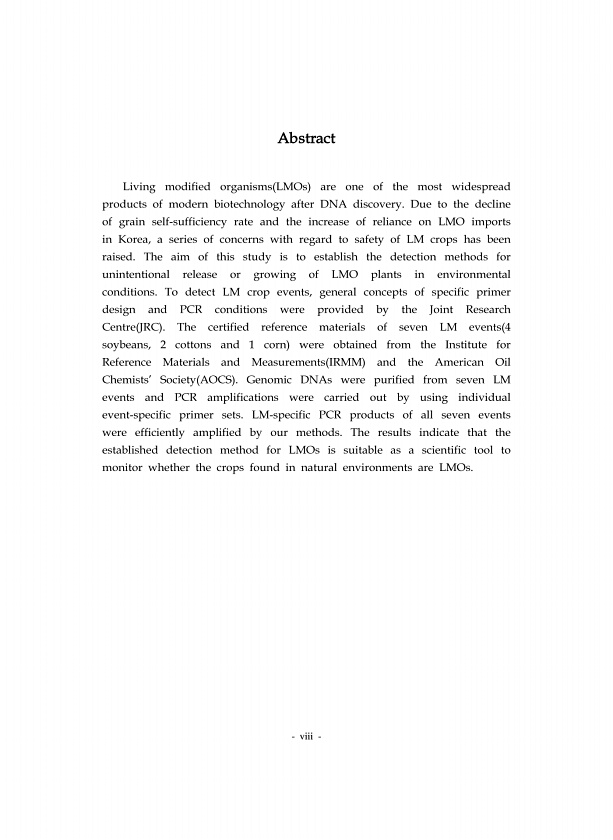 viii Abstract Living modified organisms LMOs are one of the most widespread products of modern biotechnology after DNA discovery. Due to the decline of grain self-sufficiency rate and the increase of reliance on LMO imports in Korea, a series of concerns with regard to safety of LM crops has been raised. The aim of this study is to establish the detection methods for unintentional release or growi...