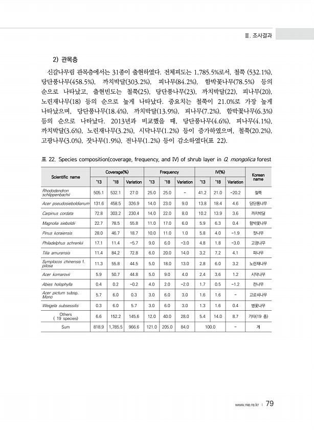 Ⅱ. 조사결과 www.nie.re.kr ? 79 2 관목층 신갈나무림 관목층에서는 31종이 출현하였다. 전체피도는 1,785.5%로서, 철쭉 532.1% , 당단풍나무 458.5% , 까치박달 303.2% , 피나무 84.2% , 함박꽃나무 78.5% 등의 순으로 나타났고, 출현빈도는 철쭉 25 , 당단풍나무 23 , 까치박달 22 , 피나무 20 , 노린재나무 18 등의 순으로 높게 나타났다. 중요치는 철쭉이 21.0%로 가장 높게 나타났으며, 당단풍나무 18.4% , 까치박달 13.9% , 피나무 7.2% , 함박꽃나무 6.3% 등의 순으로 나타났다. 2013년과 비교했을 때, 당단풍나무 4.6% , 피나무 4.1% , 까치박달 3.6% , 노린재나무 3.2% , 시닥나무 1.2% 등이 증가하였으며, 철...
