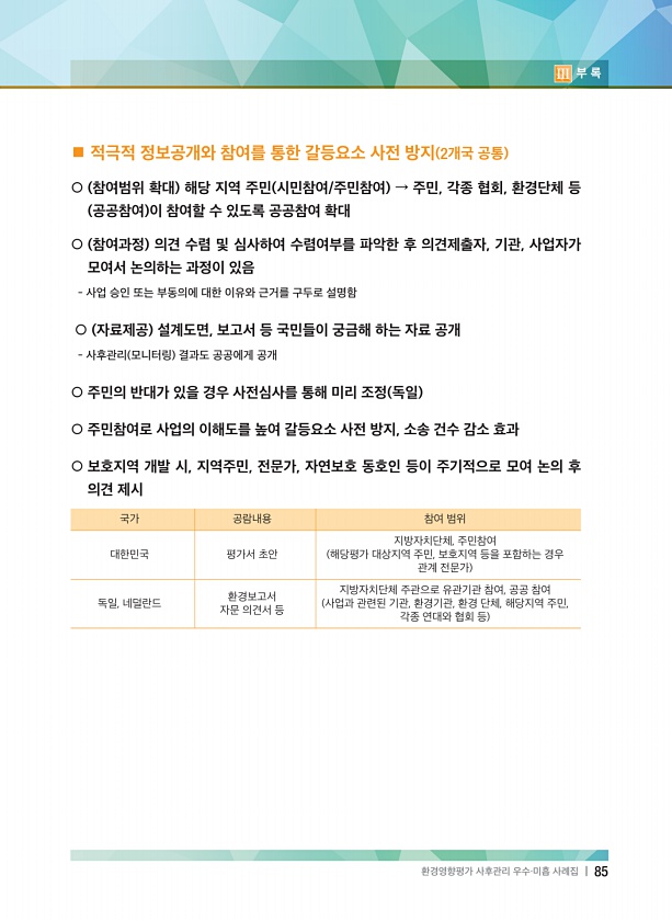 생태동아리 탐구대회 고 등부관리 우수 · 미흡 사례집 | 85 적극적 정보공개와 참여를 통한 갈등요소 사전 방지 2개국 공통 ○ 참여범위 확대 해당 지역 주민 시민참여/주민참여 → 주민, 각종 협회, 환경단체 등 공공참여 이 참여할 수 있도록 공공참여 확대 ○ 참여과정 의견 수렴 및 심사하여 수렴여부를 파악한 후 의견제출자, 기관, 사업자가 모여서 논의하는 과정이 있음 사업 승인 또는 부동의에 대한 이유와 근거를 구두로 설명함 ○ 자료제공 설계도면, 보고서 등 국민들이 궁금해 하는 자료 공개 사후관리 모니터링 결과도 공공에게 공개 ○ 주민의 반대가 있을 경우 사전심사를 통해 미리 조정 독일 ○ 주민참여로 사업의 이해도를 높여 갈등요소 사전 방지, 소송 건수 감소 효과 ○ 보호지역 개발 시, 지역주민, 전문가...