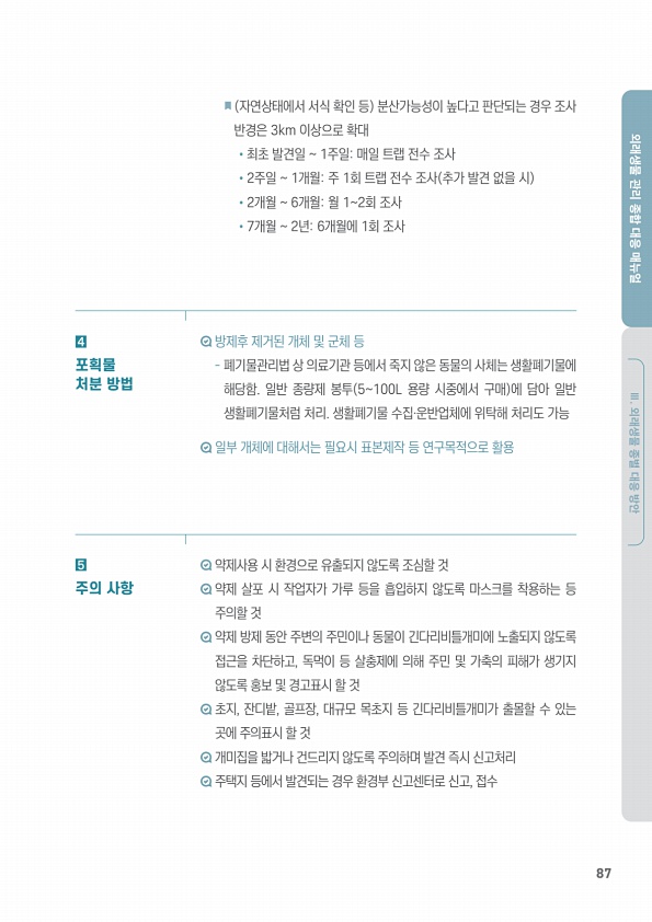 87 외래생물 관리 종합 대응 매뉴얼 Ⅲ. 외래생물 종별 대응 방안 자연상태에서 서식 확인 등 분산가능성이 높다고 판단되는 경우 조사 반경은 3km 이상으로 확대 ?최초 발견일 1주일매일 트랩 전수 조사 ?2주일 1개월주 1회 트랩 전수 조사 추가 발견 없을 시 ?2개월 6개월월 12회 조사 ?7개월 2년6개월에 1회 조사 ? 방제후 제거된 개체 및 군체 등 폐기물관리법 상 의료기관 등에서 죽지 않은 동물의 사체는 생활폐기물에 해당함. 일반 종량제 봉투 5100L 용량 시중에서 구매 에 담아 일반 생활폐기물처럼 처리. 생활폐기물 수집·운반업체에 위탁해 처리도 가능 일부 개체에 대해서는 필요시 표본제작 등 연구목적으로 활용 ? 약제사용 시 환경으로 유출되지 않도록 조심할 것 약제 살포 시 작업자가 가루 등을 ...