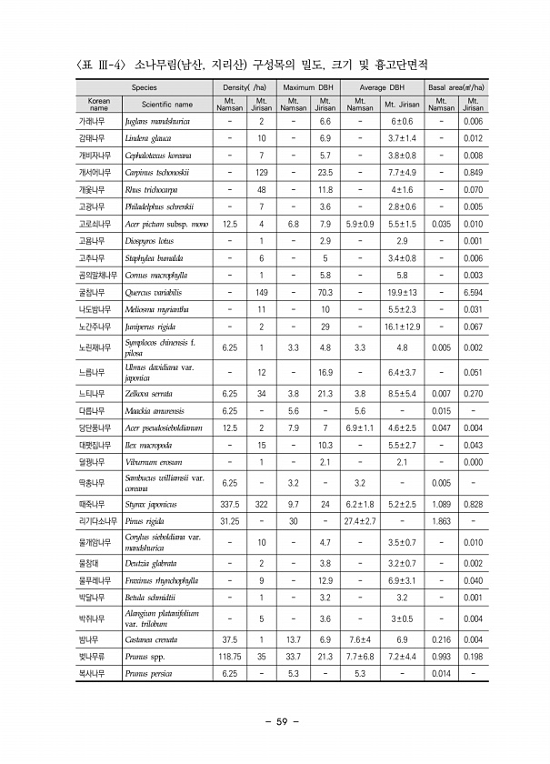 59 Species Density /ha Maximum DBH Average DBH Basal area ㎡/ha Korean name Scientific name Mt. Namsan Mt. Jirisan Mt. Namsan Mt. Jirisan Mt. Namsan Mt. Jirisan Namsan Mt. Jirisan Mt. 가래나무 Juglans mandshurica 2 6.6 6±0.6 0.006 감태나무 Lindera glauca 10 6.9 3.7±1.4 0.012 개비자나무 Cephalotaxus koreana 7 5.7 3.8±0.8 0.008 개서어나무 Carpinus tschonoskii 129 23.5 7.7±4.9 0.849 개옻나무 Rhus trichocarpa 48 11.8 4±1.6 ...
