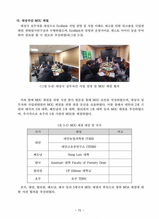 75 다. 대상국간 MOU 체결 대상국 실무자를 대상으로 EcoBank 사업 설명 및 사업 이해도 제고를 위한 워크숍을 국립생 태원 생태평가연구실과 수행하였으며, EcoBank의 설명과 운영사이트 게스트 아이디 등을 부여 하여 검토를 할 수 있도록 추진하였다 그림 5-3 그림 5-4 대상국 실무자간 사업 설명 및 MOU 체결 협의 이와 함께 MOU 체결을 위한 사전 현지 방문을 통해 MOU 초안을 작성하였으며, 대상국 실 무자와 국립생태원의 MOU 체결을 위한 최종 문건을 조율하였다. 이를 통해서 대만의 2개 기 관과 태국의 1개 대학, 베트남의 1개 대학, 필리핀의 1개 대학 등과 MOU 체결을 추진하였으 며, 추가적으로 호주의 1개 기관과 MOU를 체결하였다. 국가 대상 비고 대만 대만농업과학원 TARI...