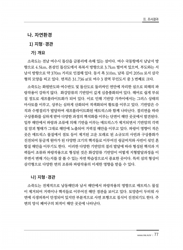 II. 조사결과 www.nie.re.kr ? 77 1 · 소죽도는 전남 여수시 돌산읍 금봉리에 속해 있는 섬이다. 여수 국동항에서 남남서 방 향으로 4.5km, 본섬인 돌산도에서 북북서 방향으로 3.7km 떨어져 있으며, 부도와는 서 남서 방향으로 약 370m 거리로 인접해 있다. 동서 폭 310m, 남북 길이 205m 로서 삼각 형의 모양을 띠고 있다. 면적은 31,736 ㎡로 여수 3 권역 무인도서 중 3 번째로 크다. 소죽도는 화원반도와 여수반도 및 돌산도로 둘러싸인 연안에 자리한 섬으로 외해의 파 랑작용이 강하지 않다. 화강암류의 기반암이 깊게 심층풍화되어 있다. 해머로 쉽게 부숴 질 정도로 새프롤라이트화가 되어 있다. 이로 인해 기반암 가까이에서는 그러스 상태의 마사토를 이루고, 상부는 심하게 산화...