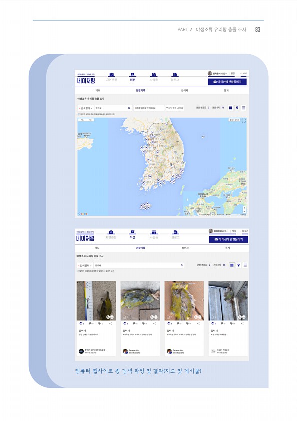 컴퓨터 웹사이트 종 검색 과정 및 결과 지도 및 게시물 PART 2 야생조류 유리창 충돌 조사83