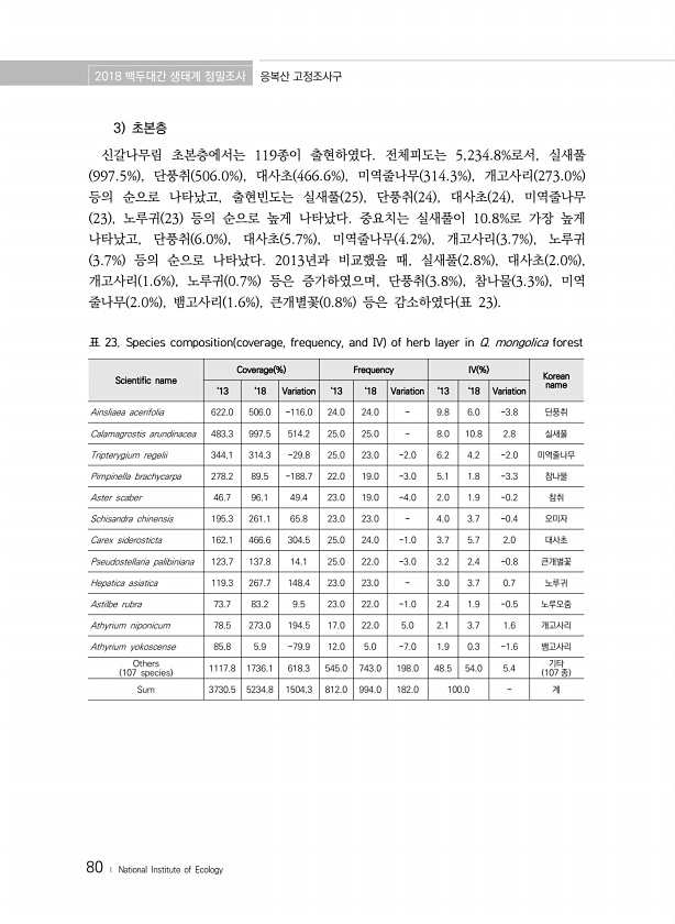 2018 백두대간 생태계 정밀조사 응복산 고정조사구 80 ? National Institute of Ecology 3 초본층 신갈나무림 초본층에서는 119종이 출현하였다. 전체피도는 5,234.8%로서, 실새풀 997.5% , 단풍취 506.0% , 대사초 466.6% , 미역줄나무 314.3% , 개고사리 273.0% 등의 순으로 나타났고, 출현빈도는 실새풀 25 , 단풍취 24 , 대사초 24 , 미역줄나무 23 , 노루귀 23 등의 순으로 높게 나타났다. 중요치는 실새풀이 10.8%로 가장 높게 나타났고, 단풍취 6.0% , 대사초 5.7% , 미역줄나무 4.2% , 개고사리 3.7% , 노루귀 3.7% 등의 순으로 나타났다. 2013년과 비교했을 때, 실새풀 2.8% , 대사초 2.0% , 개고사리 ...
