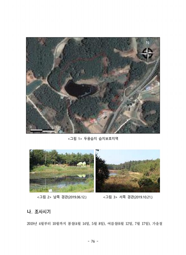 76 그림 1 두웅습지 습지보호지역 그림 2 남쪽 경관 2019.06.12. 그림 3 서쪽 경관 2019.10.21. 나. 조사시기 2019년 4월부터 10월까지 봄철 4월 14일, 5월 8일 , 여름철 6월 12일, 7월 17일 ,가을철