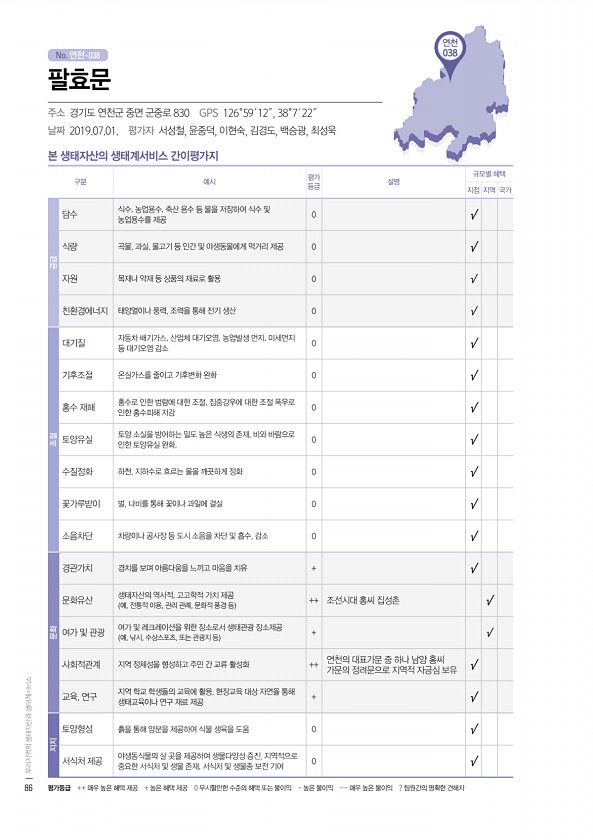 No. 연천- 연천 038 본 생태자산의 생태계서비스 간이평가지 구분 예시 평가 등급 설명 규모별 혜택 지점 지역 국가 공급 담수 식수, 농업용수, 축산 용수 등 물을 저장하여 식수 및 농업용수를 제공 0 √ 식량 곡물, 과실, 물고기 등 인간 및 야생동물에게 먹거리 제공 0 √ 자원 목재나 약재 등 상품의 재료로 활용 0 √ 친환경에너지 태양열이나 풍력, 조력을 통해 전기 생산 0 √ 조절 대기질 자동차 배기가스, 산업체 대기오염, 농업발생 먼지, 미세먼지 등 대기오염 감소 0 √ 기후조절 온실가스를 줄이고 기후변화 완화 0 √ 홍수 재해 홍수로 인한 범람에 대한 조절, 집중강우에 대한 조절 폭우로 인한 홍수피해 저감 0 √ 토양유실 토양 소실을 방어하는 밀도 높은 식생의 존재, 비와 바람으로 인한 토양유...