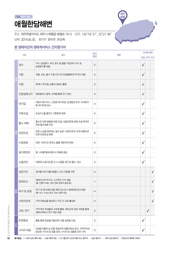 No. 제주- 제주 038 본 생태자산의 생태계서비스 간이평가지 구분 예시 평가 등급 설명 규모별 혜택 지점 지역 국가 공급 담수 식수, 농업용수, 축산 용수 등 물을 저장하여 식수 및 농업용수를 제공 0 √ 식량 곡물, 과실, 물고기 등 인간 및 야생동물에게 먹거리 제공 0 √ 자원 목재나 약재 등 상품의 재료로 활용 0 √ 친환경에너지 태양열이나 풍력, 조력을 통해 전기 생산 0 √ 조절 대기질 자동차 배기가스, 산업체 대기오염, 농업발생 먼지, 미세먼지 등 대기오염 감소 0 √ 기후조절 온실가스를 줄이고 기후변화 완화 0 √ 홍수 재해 홍수로 인한 범람에 대한 조절, 집중강우에 대한 조절 폭우로 인한 홍수피해 저감 0 √ 토양유실 토양 소실을 방어하는 밀도 높은 식생의 존재, 비와 바람으로 인한 토양유...
