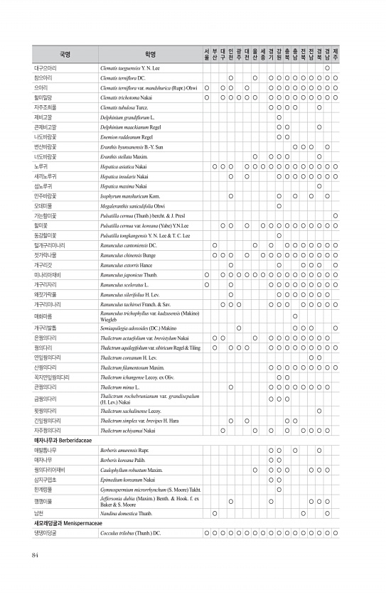 84 대구으아리 Clematis taeguensiss Y. N. Lee ○ 참으아리 Clematis ternifora DC. ○ ○ ○ ○ ○ ○ ○ ○ ○ ○ ○ 으아리 Clematis ternifora var. mandshurica Rupr. Ohwi ○ ○ ○ ○ ○ ○ ○ ○ ○ ○ ○ ○ ○ 할미밀망 Clematis trichotoma Nakai ○ ○ ○ ○ ○ ○ ○ ○ ○ ○ ○ ○ ○ ○ ○ 자주조희풀 Clematis tubulosa Turcz. ○ ○ ○ ○ ○ 제비고깔 Delphinium grandiforum L. ○ 큰제비고깔 Delphinium maackianum Regel ○ ○ ○ 나도바람꽃 Enemion raddeanum Regel ○ ○ 변산바람꽃 Eranthis byunsan...