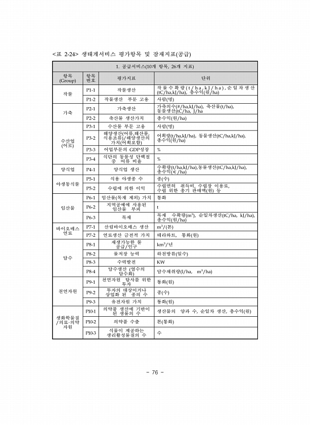 76 공급서비스 개 항목 개 지표 항목 항목 번호 평가지표 단위 작물 작물생산 작 물 수 확 량 순 일 차 생 산 총수익 원 작물생산 부문 고용 사람 명 가축 가축생산 가축의수 축산물 동물생산 축산물 생산가치 총수익 원 수산업 어로 수산물 부문 고용 사람 명 해양생산 어류 해산물 식용조류 해양생산의 가치 어획포함 어획량 동물생산 총수익 원 어업부문의 성장 식단의 동물성 단백질 중 어류 비율 양식업 양식업 생산 수확량 동물생산 총수익 야생동식물 식용 야생종 수 종 수 수렵에 의한 이익 수렵면허 취득비 수렵장 이용료 수렵 위한 총기 판매액 원 등 임산물 임산물 목재 제외 가치 통화 지역공예에 사용된 임산물 부피 목재 목재 수확량 순일차생산 총수익 원 바이오매스 연료 산림바이오매스 생산 톤 연료생산 금전적 가치 ...