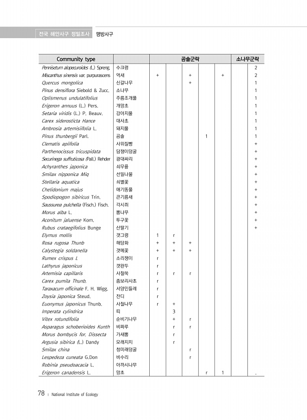 전국 해안사구 정밀조사 맹방사구 78 ? National Institute of Ecology Community type 곰솔군락 소나무군락 Pennisetum alopecuroides L. Spreng. 수크령 2 Miscanthus sinensis var. purpurascens 억새 + + + 2 Quercus mongolica 신갈나무 + 1 Pinus densiflora Siebold & Zucc. 소나무 1 Oplismenus undulatifolius 주름조개풀 1 Erigeron annuus L. Pers. 개망초 1 Setaria viridis L. P. Beauv. 강아지풀 1 Carex siderosticta Hance 대사초 1 Ambrosia artemisiifolia L. 돼지풀 1...