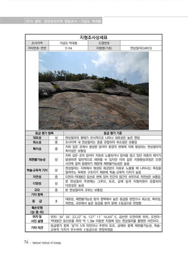 2015 생태·경관보전지역 정밀조사 거금도 적대봉 76 ? National Institute of Ecology 지형조사상세표 조사지역 거금도 적대봉 도엽번호 격자번호-연번 3-04 지형명 기호 판상절리 GM03 등급 평가 항목 등급 평가 기준 대표성 상 판상절리의 형태가 모식적으로 나타나 대표성은 높은 편임 희소성 중 조사지역 내 판상절리는 종종 관찰되어 희소성은 보통임 특이성 중 지하 깊은 곳에서 생성된 암석이 환경의 변화에 의해 형성되는 판상절리의 특이성은 보통임 재현불가능성 상 지하 깊은 곳의 암석이 지표로 노출되거나 암석을 덮고 있던 하중의 제거가 발생하면 일반적으로 재현될 수 있지만 이와 같은 지형형성과정은 오랜 시간에 걸쳐 발생하기 때문에 재현불가능성은 높음 학술?교육적 가치 상 판상절리는 지하...