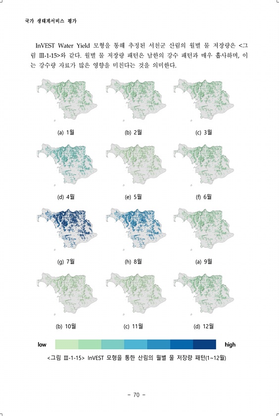 국가 생태계서비스 평가 70 InVEST Water Yield 모형을 통해 추정된 서천군 산림의 월별 물 저장량은 그 림 Ⅲ-1-15 와 같다. 월별 물 저장량 패턴은 남한의 강수 패턴과 매우 흡사하며, 이 는 강수량 자료가 많은 영향을 미친다는 것을 의미한다. a 1월 b 2월 c 3월 d 4월 e 5월 f 6월 g 7월 h 8월 a 9월 b 10월 c 11월 d 12월 low high 그림 Ⅲ-1-15 InVEST 모형을 통한 산림의 월별 물 저장량 패턴 112월