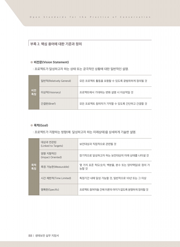 88 | 생태보전 실무 지침서 O p e n S t a n d a r d s f o r t h e P r a c t i c e o f C o n s e r v a t i o n 부록 2. 핵심 용어에 대한 기준과 정의 ● 비전문 Vision Statement 프로젝트가 달성하고자 하는 상태 또는 궁극적인 상황에 대한 일반적인 설명. 비전 특징 일반적 Relatively General 모든 프로젝트 활동을 포함할 수 있도록 광범위하게 정의될 것 이상적 Visionary 프로젝트에서 기대하는 변화 설명 시 이상적일 것 간결한 Brief 모든 프로젝트 참여자가 기억할 수 있도록 간단하고 간결할 것 ● 목적 Goal 프로젝트가 지향하는 방향 예달성하고자 하는 미래상태 을 상세하게 기술한 설명. 목적 특징 대상과 연...