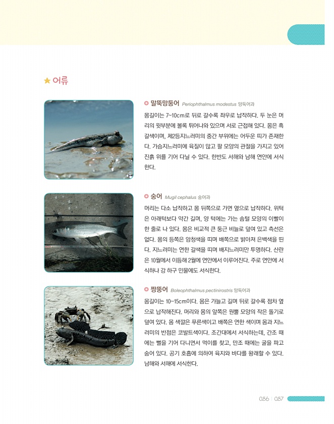 086 087 어류 말뚝망둥어 Periophthalmus modestus 망둑어과 몸길이는 710cm로 뒤로 갈수록 좌우로 납작하다. 두 눈은 머 리의 윗부분에 볼록 튀어나와 있으며 서로 근접해 있다. 몸은 흑 갈색이며, 제2등지느러미의 중간 부위에는 어두운 띠가 존재한 다. 가슴지느러미에 육질이 많고 팔 모양의 관절을 가지고 있어 진흙 위를 기어 다닐 수 있다. 한반도 서해와 남해 연안에 서식 한다. 짱뚱어 Boleophthalmus pectinirostris 망둑어과 몸길이는 1015cm이다. 몸은 가늘고 길며 뒤로 갈수록 점차 옆 으로 납작해진다. 머리와 몸의 앞쪽은 원뿔 모양의 작은 돌기로 덮여 있다. 몸 색깔은 푸른색이고 배쪽은 연한 색이며 몸과 지느 러미의 반점은 코발트색이다. 조간대에서 서식하는...