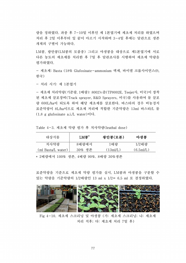 77 량을 정하였다. 파종 후 7-10일 이후인 제 1본엽기에 제초제 처리를 하였으며 처리 후 2일 이후부터 잎 끝이 마르기 시작하며 3-4일 후에는 달관으로 생존 개체의 구별이 가능하다. LM콩, 광안콩 LM콩의 모품종 그리고 야생콩을 대상으로 제1본엽기에 서로 다른 농도의 제초제를 처리한 후 7일 후 달관조사를 시행하여 제초제 약량을 평가하였다. 제초제Basta 18% Glufosinate-ammonium 액제, 바이엘 크롭사이언스㈜, 한국 처리 시기제 1본엽기 제초제 처리약량 기준량, 1배량 8002노즐 TP8002E, Teejet사, 미국 이 장착 된 제초제 살포장비 Track sprayer, R&D Sprayers, 미국 를 사용하여 물 살포 량 600L/ha이 되도록 하여 해당 제초제를 살포한다....