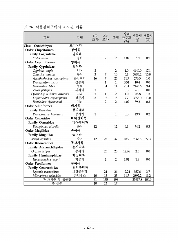 62 학명 국명 1차 조사 2차 조사 총합 상대 풍부도 % 생물량 g 생물량 % Class Osteichthyes 조기어강 Order Clupeiformes 청어목 Family Engraulidae 멸치과 Coilia nasus 웅어 2 2 1.02 31.1 0.1 Order Cypriniformes 잉어목 Family Cyprinidae 잉어과 Cyprinus carpio 잉어 2 2 1.0 4440.0 17.1 Carassius auratus 붕어 3 7 10 5.1 3886.2 15.0 Acanthorhodeus macropterus 큰납지리 16 7 23 11.7 270.3 1.0 Pseudorasbora parva 참붕어 1 1 0.51 10.4 0.0 Hemibarbus labeo 누치 14 14...