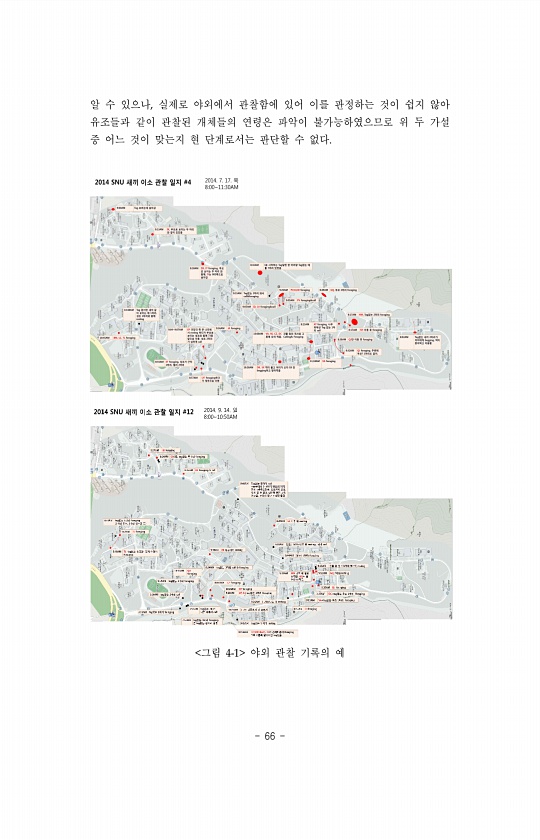 66 알 수 있으나, 실제로 야외에서 관찰함에 있어 이를 판정하는 것이 쉽지 않아 유조들과 같이 관찰된 개체들의 연령은 파악이 불가능하였으므로 위 두 가설 중 어느 것이 맞는지 현 단계로서는 판단할 수 없다. 그림 4-1 야외 관찰 기록의예