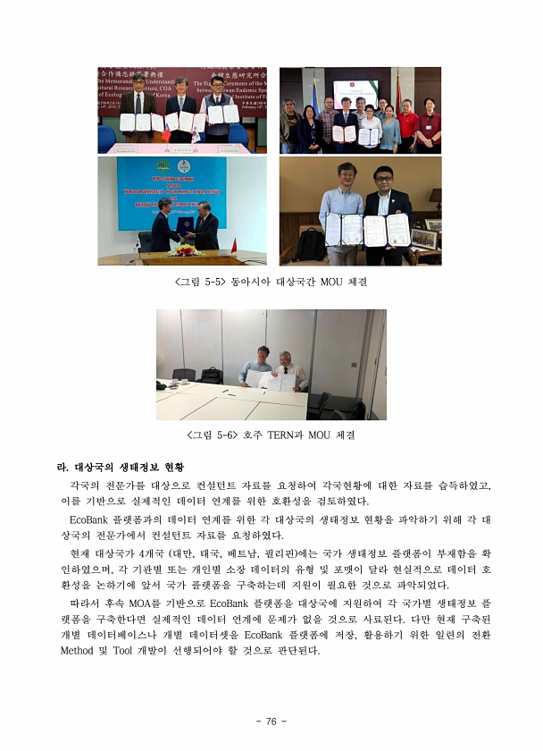 76 그림 5-5 동아시아 대상국간 MOU 체결 그림 5-6 호주 TERN과 MOU 체결 라. 대상국의 생태정보 현황 각국의 전문가를 대상으로 컨설턴트 자료를 요청하여 각국현황에 대한 자료를 습득하였고, 이를 기반으로 실제적인 데이터 연계를 위한 호환성을 검토하였다. EcoBank 플랫폼과의 데이터 연계를 위한 각 대상국의 생태정보 현황을 파악하기 위해 각 대 상국의 전문가에서 컨설턴트 자료를 요청하였다. 현재 대상국가 4개국 대만, 태국, 베트남, 필리핀 에는 국가 생태정보 플랫폼이 부재함을 확 인하였으며, 각 기관별 또는 개인별 소장 데이터의 유형 및 포맷이 달라 현실적으로 데이터 호 환성을 논하기에 앞서 국가 플랫폼을 구축하는데 지원이 필요한 것으로 파악되었다. 따라서 후속 MOA를 기반으로 EcoBa...