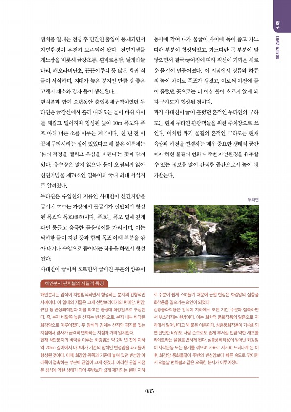 085 양구 DDDDDDD 펀치볼 일대는 전쟁 후 민간인 출입이 통제되면서 자연환경이 온전히 보존되어 왔다. 천연기념물 개느삼을 비롯해 금강초롱, 흰비로용담, 날개하늘 나리, 해오라비난초, 끈끈이주걱 등 많은 희귀 식 물이 서식하며, 지대가 높은 분지인 만큼 질 좋은 고랭지 채소와 감자 등이 생산된다. 펀치볼과 함께 오랫동안 출입통제구역이었던 두 타연은 금강산에서 흘러 내려오는 물이 바위 사이 를 헤집고 떨어지며 형성된 높이 10m 폭포와 폭 포 아래 너른 소를 이루는 계곡이다. 천 년 전 이 곳에 두타사라는 절이 있었다고 해 붙은 이름에는 ‘삶의 걱정을 떨치고 욕심을 버린다’는 뜻이 담겨 있다. 유수량은 많지 않으나 물이 오염되지 않아 천연기념물 제74호인 열목어의 국내 최대 서식지 로 알려졌다. 두타연은...