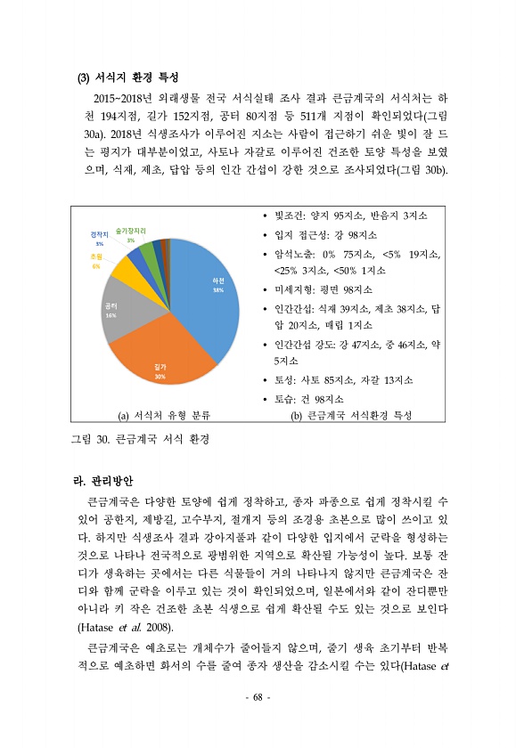 68 3 서식지 환경 특성 20152018년 외래생물 전국 서식실태 조사 결과 큰금계국의 서식처는 하 천 194지점, 길가 152지점, 공터 80지점 등 511개 지점이 확인되었다 그림 30a 2018년 식생조사가 이루어진 지소는 사람이 접근하기 쉬운 빛이 잘 드 는 평지가 대부분이었고, 사토나 자갈로 이루어진 건조한 토양 특성을 보였 으며, 식재, 제초, 답압 등의 인간 간섭이 강한 것으로 조사되었다 그림 30b ? 빛조건양지 95지소, 반음지 3지소 ? 입지 접근성강 98지소 ? 암석노출0% 75지소, 5% 19지소, 25% 3지소, 50% 1지소 ? 미세지형평면 98지소 ? 인간간섭식재 39지소, 제초 38지소, 답 압 20지소, 매립 1지소 ? 인간간섭 강도강 47지소, 중 46지소, 약 5지소 ? ...