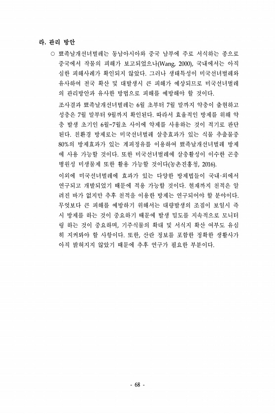 68 라. 관리 방안 ○ 뾰족날개선녀벌레는 동남아시아와 중국 남부에 주로 서식하는 종으로 중국에서 작물의 피해가 보고되었으나 Wang, 2000 , 국내에서는 아직 심한 피해사례가 확인되지 않았다. 그러나 생태특성이 미국선녀벌레와 유사하여 전국 확산 및 대발생시 큰 피해가 예상되므로 미국선녀벌레 의 관리방안과 유사한 방법으로 피해를 예방해야 할 것이다. 조사결과 뾰족날개선녀벌레는 6월 초부터 7월 말까지 약충이 출현하고 성충은 7월 말부터 9월까지 확인된다. 따라서 효율적인 방제를 위해 약 충 발생 초기인 6월7월초 사이에 약제를 사용하는 것이 적기로 판단 된다. 친환경 방제로는 미국선녀벌레 살충효과가 있는 식물 추출물중 80%의 방제효과가 있는 계피정유를 이용하여 뾰족날개선녀벌레 방제 에 사용 가능할 것이...