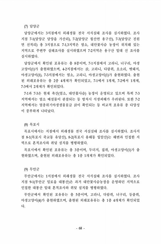 68 7 담양군 담양군에서는 3지점에서 외래생물 전국 서식실태 조사를 실시하였다. 조사 지점 7-1 담양군 담양읍 가산리 , 7-2 담양군 월산면 용구산 , 7-3 담양군 진원 면 선적리 총 3지점으로 7-1,3지역은 염소, 대만꽃사슴 농장이 위치해 있는 지역으로 주변부 실태조사를 실시하였으며 7-2지역은 용구산 일대 선 조사를 실시하였다. 담양군에서 확인된 포유류는 총 8종이며, 7-1지점에서 고라니, 너구리, 야생 고양이 1 가 출현하였으며, 4-2지점에서는 삵, 고라니, 다람쥐, 오소리, 멧돼지, 야생고양이 1 , 7-3지점에서는 염소, 고라니, 야생고양이 1 가 출현하였다. 출현 된 외래포유류는 총 2종 4개체가 확인되었고, 7-1에서 1개체, 7-2에서 1개체, 7-3에서 2개체가 확인되었다. 7-...