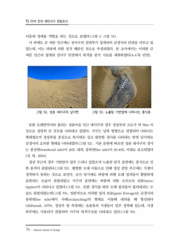2016 전국 해안사구 정밀조사 76 ? National Institute of Ecology 이동에 장애물 역할을 하는 것으로 보였다 그림 6 그림 51 이 외에도 큰 여끝 인근에는 전사구의 전면부가 절개되어 급경사의 단면을 이루고 있 었는데, 이는 파랑에 의한 침식 때문인 것으로 추정되었다. 본 조사에서는 이러한 큰 여끝 인근의 절개된 전사구 단면에서 퇴적물 분석 시료를 채취하였다 A-A’축 단면 그림 52. 성촌 대사구의 남사면 그림 53. 노출된 기반암에 나타나는 풍식흔 또한 모래언덕이라 불리는 성촌마을 인근 대사구의 경우 정상부의 고도가 약 50m 이 상으로 상당히 큰 규모를 나타내고 있었다. 사구는 남북 방향으로 연결되어 나타나는 형태였으며 정상부를 중심으로 북사면은 길고 완만한 경사를 나타내는 ...