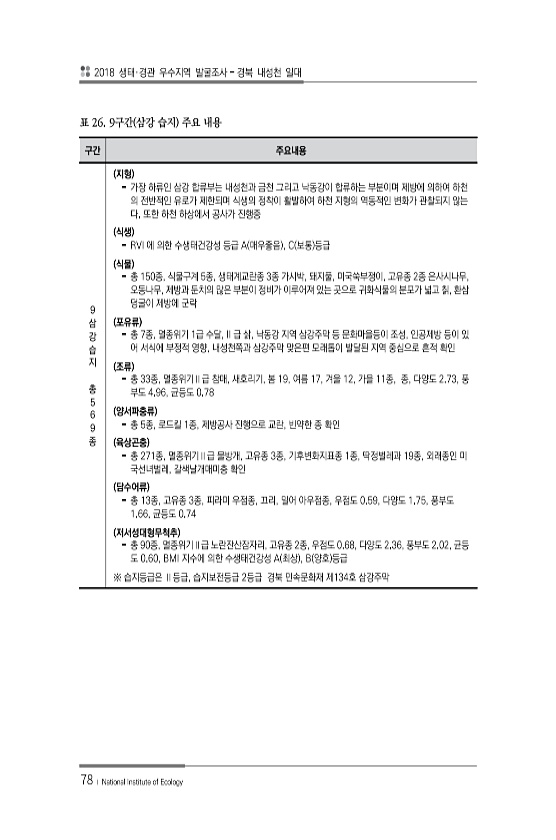 2018 생태·경관 우수지역 발굴조사 경북 내성천 일대 78 ? National Institute of Ecology 구간 주요내용 9 삼 강 습 지 총 5 6 9 종 지형 가장 하류인 삼강 합류부는 내성천과 금천 그리고 낙동강이 합류하는 부분이며 제방에 의하여 하천 의 전반적인 유로가 제한되며 식생의 정착이 활발하여 하천 지형의 역동적인 변화가 관찰되지 않는 다. 또한 하천 하상에서 공사가 진행중 식생 RVI 에 의한 수생태건강성 등급 A 매우좋음 , C 보통 등급 식물 총 150종, 식물구계 5종, 생태계교란종 3종 가시박, 돼지풀, 미국쑥부쟁이, 고유종 2종 은사시나무, 오동나무, 제방과 둔치의 많은 부분이 정비가 이루어져 있는 곳으로 귀화식물의 분포가 넓고 칡, 환삼 덩굴이 제방에 군락 포유류 총 7...