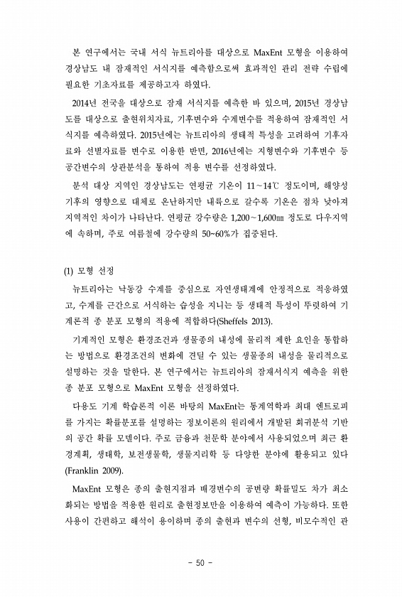 본 연구에서는 국내 서식 뉴트리아를 대상으로 MaxEnt 모형을 이용하여 경상남도 내 잠재적인 서식지를 예측함으로써 효과적인 관리 전략 수립에 필요한 기초자료를 제공하고자 하였다. 2014년 전국을 대상으로 잠재 서식지를 예측한 바 있으며, 2015년 경상남 도를 대상으로 출현위치자료, 기후변수와 수계변수를 적용하여 잠재적인 서 식지를 예측하였다. 2015년에는 뉴트리아의 생태적 특성을 고려하여 기후자 료와 선별자료를 변수로 이용한 반면, 2016년에는 지형변수와 기후변수 등 공간변수의 상관분석을 통하여 적용 변수를 선정하였다. 분석 대상 지역인 경상남도는 연평균 기온이 11∼14℃ 정도이며, 해양성 기후의 영향으로 대체로 온난하지만 내륙으로 갈수록 기온은 점차 낮아져 지역적인 차이가 나타난다. 연평균 강수...