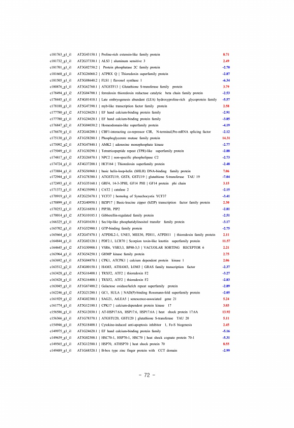 72 c181763_g1_i1 AT2G43150.1 | Proline-rich extensin-like family protein 8.71 c181732_g1_i1 AT2G37330.1 | ALS3 | aluminum sensitive 3 2.49 c181701_g1_i1 AT3G02750.2 | Protein phosphatase 2C family protein -2.70 c181668_g1_i1 AT3G26060.2 | ATPRX Q | Thioredoxin superfamily protein -2.87 c181505_g1_i1 AT5G08640.2 | FLS1 | flavonol synthase 1 -6.34 c180876_g1_i1 AT3G62760.1 | ATGSTF13 | Glutathione S...