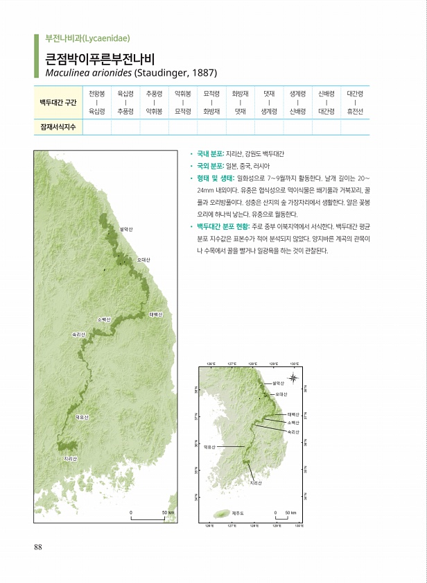 88 ? 국내 분포지리산, 강원도 백두대간 ? 국외 분포일본, 중국, 러시아 ? 형태 및 생태일화성으로 7∼9월까지 활동한다. 날개 길이는 20∼ 24mm 내외이다. 유충은 협식성으로 먹이식물은 쐐기풀과 거북꼬리, 꿀 풀과 오리방풀이다. 성충은 산지의 숲 가장자리에서 생활한다. 알은 꽃봉 오리에 하나씩 낳는다. 유충으로 월동한다. ? 백두대간 분포 현황주로 중부 이북지역에서 서식한다. 백두대간 평균 분포 지수값은 표본수가 적어 분석되지 않았다. 양지바른 계곡의 관목이 나 수목에서 꿀을 빨거나 일광욕을 하는 것이 관찰된다. 백두대간 구간 천왕봉 | 육십령 육십령 | 추풍령 추풍령 | 악휘봉 악휘봉 | 묘적령 묘적령 | 화방재 화방재 | 댓재 댓재 | 생계령 생계령 | 신배령 신배령 | 대간령 대간령 | 휴전선...