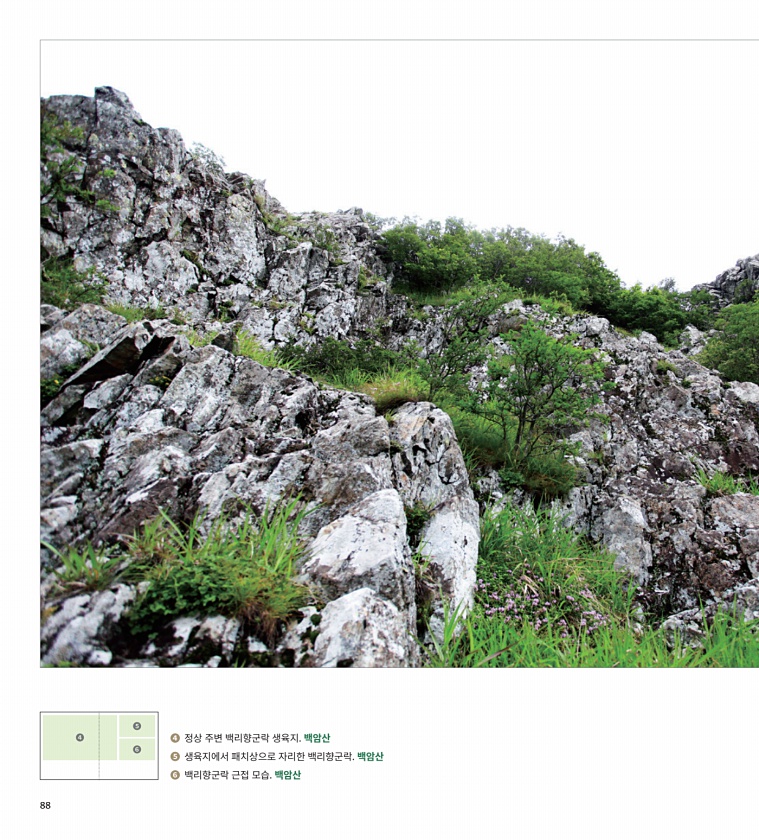 ? ?? ? 정상 주변 백리향군락 생육지. 백암산 ? 생육지에서 패치상으로 자리한 백리향군락. 백암산 ? 백리향군락 근접 모습. 백암산88