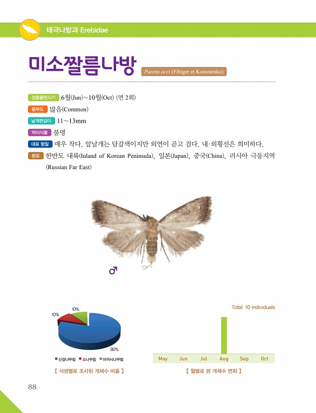 88 태극나방과 Erebidae 성충출현시기 6월 Jun 10월 Oct 연 2회 풍부도 많음 Common 날개편길이 1113mm 먹이식물 불명 대표 형질 매우 작다. 앞날개는 담갈색이지만 외연이 곧고 검다. 내·외횡선은 희미하다. 분포 한반도 내륙 Inland of Korean Peninsula , 일본 Japan , 중국 China , 러시아 극동지역 Russian Far East 미소짤름나방 Parens occi Fibiger et Kononenko 【 월별로 본 개체수 변화 】 Total10 individuals 【 식생별로 조사된 개체수 비율 】 10% 신갈나무림 소나무림 아까시나무림 10% 80% May Jun Jul Aug SepOct