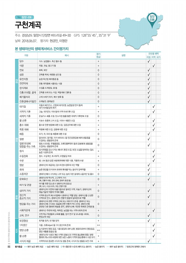 No. 밀양- 본 생태자산의 생태계서비스 간이평가지 구분 예시 평가 등급 설명 규모별 혜택 지점 지역 국가 공급 담수 식수, 농업용수, 축산 용수 등 + √ 식량 곡물, 과실, 물고기 등 + √ 연료 화목, 토탄 0 √ 섬유 건축용 목재, 의류용 섬유 등 0 √ 유전자원 농업·축산업 희귀품종 등 0 √ 천연약재 전통 의약품에 사용되는 식물 0 √ 장식재료 수집용 조개껍질, 꽃 등 0 √ 진흙,미네랄, 골재 건축용 모래 또는 자갈, 벽돌재료 진흙 등 0 √ 폐기물처리 고체 쓰레기 하치, 폐수 방류 등 0 √ 친환경에너지발전 조력발전, 풍력발전 0 √ 조절 대기질 자동차 배기가스, 산업체 대기오염, 농업발생 먼지 등의 대기 미세물질의 제거 + √ 지역적 기후 그늘, 대기온도 저하 등의 지역 미세기후 조절 + √...