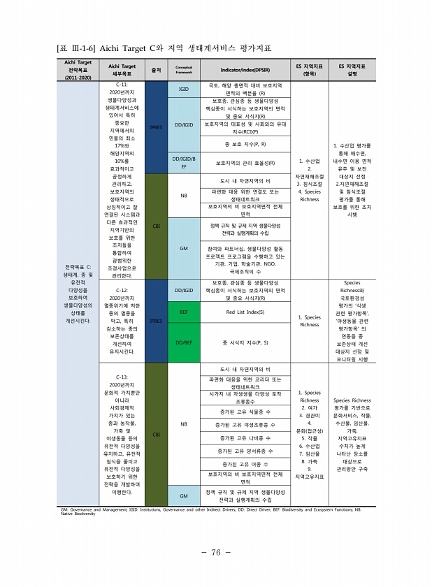 76 Aichi Target 전략목표 2011-2020 Aichi Target 세부목표 출처 Conceptual Framework Indicator/index DPSIR ES 지역지표 항목 ES 지역지표 설명 전략목표 C생태계, 종 및 유전적 다양성을 보호하여 생물다양성의 상태를 개선시킨다. C-112020년까지 생물다양성과 생태계서비스에 있어서 특히 중요한 지역에서의 민물의 최소 17%와 해양지역의 10%를 효과적이고 공정하게 관리하고, 보호지역의 생태적으로 상징적이고 잘 연결된 시스템과 다른 효과적인 지역기반의 보호를 위한 조치들을 통합하여 광범위한 조경사업으로 관리한다. IPBES IGID 국토, 해양 총면적 대비 보호지역 면적의 백분율 R 1. 수산업 2. 자연재해조절 3. 침식조절 4. Specie...