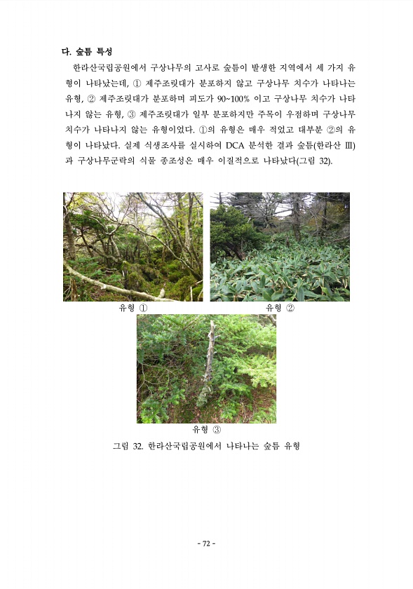 72 다. 숲틈 특성 한라산국립공원에서 구상나무의 고사로 숲틈이 발생한 지역에서 세 가지 유 형이 나타났는데, ① 제주조릿대가 분포하지 않고 구상나무 치수가 나타나는 유형, ② 제주조릿대가 분포하며 피도가 90100% 이고 구상나무 치수가 나타 나지 않는 유형, ③ 제주조릿대가 일부 분포하지만 주목이 우점하며 구상나무 치수가 나타나지 않는 유형이었다. ①의 유형은 매우 적었고 대부분 ②의 유 형이 나타났다. 실제 식생조사를 실시하여 DCA 분석한 결과 숲틈 한라산 Ⅲ 과 구상나무군락의 식물 종조성은 매우 이질적으로 나타났다 그림 32 유형 ① 유형 ② 유형 ③ 그림 32. 한라산국립공원에서 나타나는 숲틈 유형 72