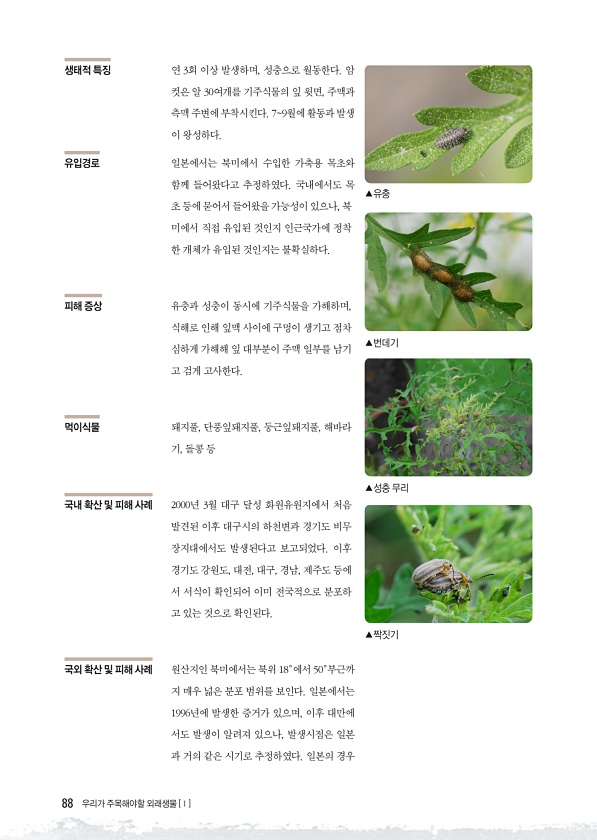 88 우리가 주목해야할 외래생물 [Ⅰ] 생태적 특징 연 3회 이상 발생하며, 성충으로 월동한다. 암 컷은 알 30여개를 기주식물의 잎 윗면, 주맥과 측맥 주변에 부착시킨다. 79월에 활동과 발생 이 왕성하다. 유입경로 일본에서는 북미에서 수입한 가축용 목초와 함께 들어왔다고 추정하였다. 국내에서도 목 초 등에 묻어서 들어왔을 가능성이 있으나, 북 미에서 직접 유입된 것인지 인근국가에 정착 한 개체가 유입된 것인지는 불확실하다. 피해 증상 유충과 성충이 동시에 기주식물을 가해하며, 식해로 인해 잎맥 사이에 구멍이 생기고 점차 심하게 가해해 잎 대부분이 주맥 일부를 남기 고 검게 고사한다. 먹이식물 돼지풀, 단풍잎돼지풀, 둥근잎돼지풀, 해바라 기, 돌콩 등 국내 확산 및 피해 사례 2000년 3월 대구 달성 화...