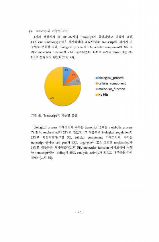 72 3 Transcript의 기능별 분류 4개의 샘플에서 총 406,207개의 transcript가 확인되었고 이들에 대한 GO Gene Ontology 분석을 실시하였다. 406,207개의 transcript를 세가지 기 능별로 분류한 결과, biological process에 9%, cellular component에 8% 그 리고 molecular function에 7%가 분류되었다. 나머지 76%의 tanscript는 No Hit로 분류되지 않았다 그림 49 그림 49. Transcript의 기능별 분류 biological process 카테고리에 속하는 transcript 중에는 metabolic process 가 24%, unclassified가 22%로 많았고, 그 다음으로 biological...