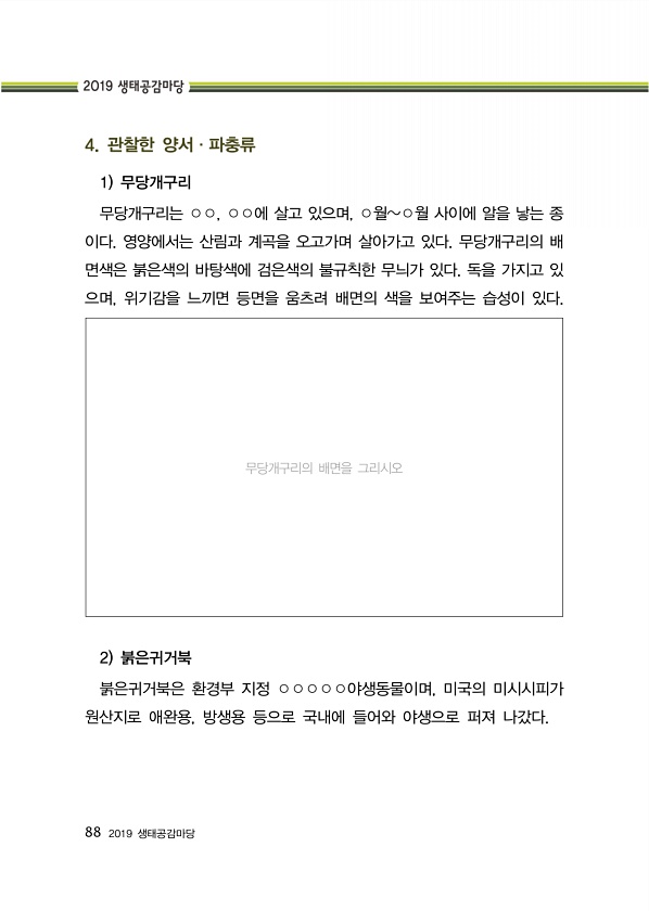 88 2019 생태공감마당 4. 관찰한 양서·파충류 1 무당개구리 무당개구리는 ○○, ○○에 살고 있으며, ○월○월 사이에 알을 낳는 종 이다. 영양에서는 산림과 계곡을 오고가며 살아가고 있다. 무당개구리의 배 면색은 붉은색의 바탕색에 검은색의 불규칙한 무늬가 있다. 독을 가지고 있 으며, 위기감을 느끼면 등면을 움츠려 배면의 색을 보여주는 습성이 있다. 무당개구리의 배면을 그리시오 2 붉은귀거북 붉은귀거북은 환경부 지정 ○○○○○야생동물이며, 미국의 미시시피가 원산지로 애완용, 방생용 등으로 국내에 들어와 야생으로 퍼져나갔다.