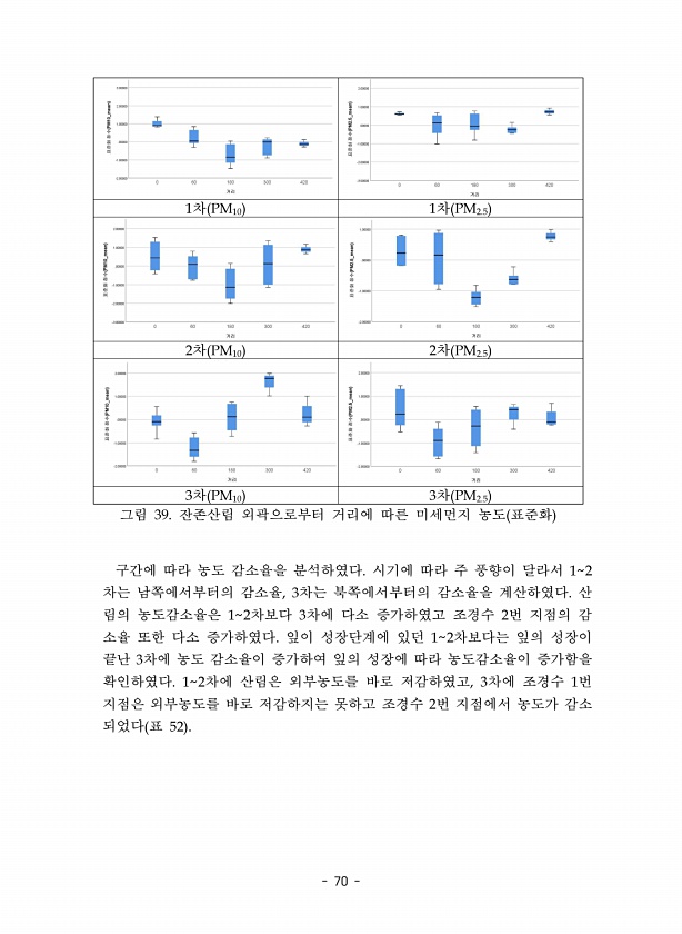 70 1차 PM16 1차 PM2.5 2차 PM16 2차 PM2.5 3차 PM16 3차 PM2.5 그림 38. 잔존산림 외곽으로부터 거리에 따른 미세먼지 농도 표준화 구간에 따라 농도 감소율을 분석하였다. 시기에 따라 주 풍향이 달라서 1C2 차는 남쪽에서부터의 감소율, 3차는 북쪽에서부터의 감소율을 계산하였다. 산 림의 농도감소율은 1C2차보다 3차에 다소 증가하였고 조경수 2번 지점의 감 소율 또한 다소 증가하였다. 잎이 성장단계에 있던 1C2차보다는 잎의 성장이 끝난 3차에 농도 감소율이 증가하여 잎의 성장에 따라 농도감소율이 증가함을 확인하였다. 1C2차에 산림은 외부농도를 바로 저감하였고, 3차에 조경수 1번 지점은 외부농도를 바로 저감하지는 못하고 조경수 2번 지점에서 농도가 감소 되었다 표 52