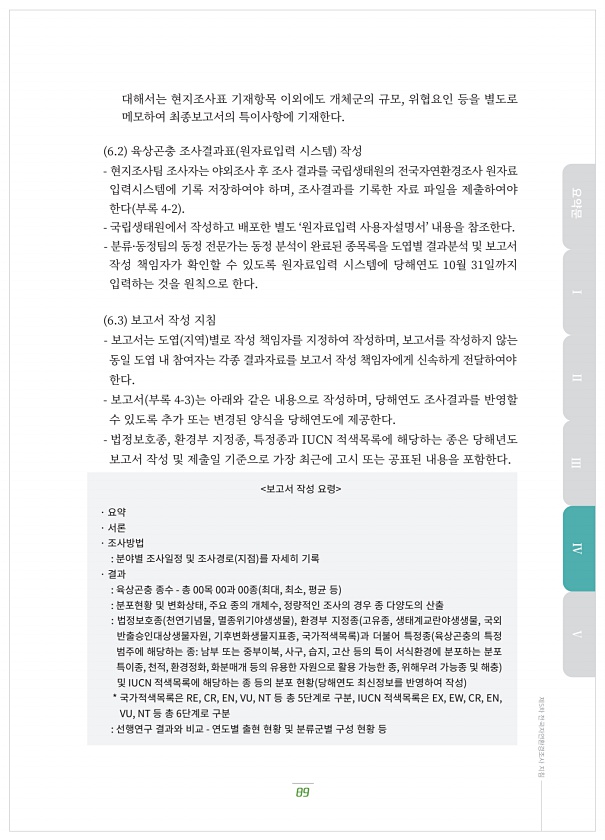 89 제5차 전국자연환경조사 지침 대해서는?현지조사표?기재항목?이외에도?개체군의?규모, 위협요인?등을?별도로 메모하여?최종보고서의?특이사항에?기재한다. ?.? 육상곤충?조사결과표 원자료입력?시스템 작성 현지조사팀?조사자는?야외조사?후?조사?결과를?국립생태원의?전국자연환경조사?원자료 입력시스템에?기록?저장하여야?하며, 조사결과를?기록한?자료?파일을?제출하여야 한다 부록 ?-? 국립생태원에서?작성하고?배포한?별도 ‘원자료입력?사용자설명서’ 내용을?참조한다. 분류·동정팀의?동정?전문가는?동정?분석이?완료된?종목록을?도엽별?결과분석?및?보고서 작성?책임자가?확인할?수?있도록?원자료입력?시스템에?당해연도 ??월 ??일까지 입력하는?것을?원칙으로?한다. ?.? 보고서?작성?지침 보고서는?도엽 지역 별로?작성?책임자를?...