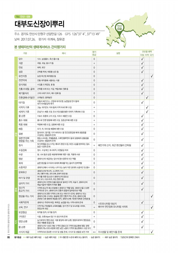 No. 안산 안산 038 본 생태자산의 생태계서비스 간이평가지 구분 예시 평가 등급 설명 규모별 혜택 지점 지역 국가 공급 담수 식수, 농업용수, 축산 용수 등 0 √ 식량 곡물, 과실, 물고기 등 + √ 연료 화목, 토탄 0 √ 섬유 건축용 목재, 의류용 섬유 등 0 √ 유전자원 농업·축산업 희귀품종 등 0 √ 천연약재 전통 의약품에 사용되는 식물 0 √ 장식재료 수집용 조개껍질, 꽃 등 0 √ 진흙,미네랄, 골재 건축용 모래 또는 자갈, 벽돌재료 진흙 등 0 √ 폐기물처리 고체 쓰레기 하치, 폐수 방류 등 0 √ 친환경에너지발전 조력발전, 풍력발전 0 √ 조절 대기질 자동차 배기가스, 산업체 대기오염, 농업발생 먼지 등의 대기 미세물질의 제거 0 √ 지역적 기후 그늘, 대기온도 저하 등의 지역 미세기후 ...