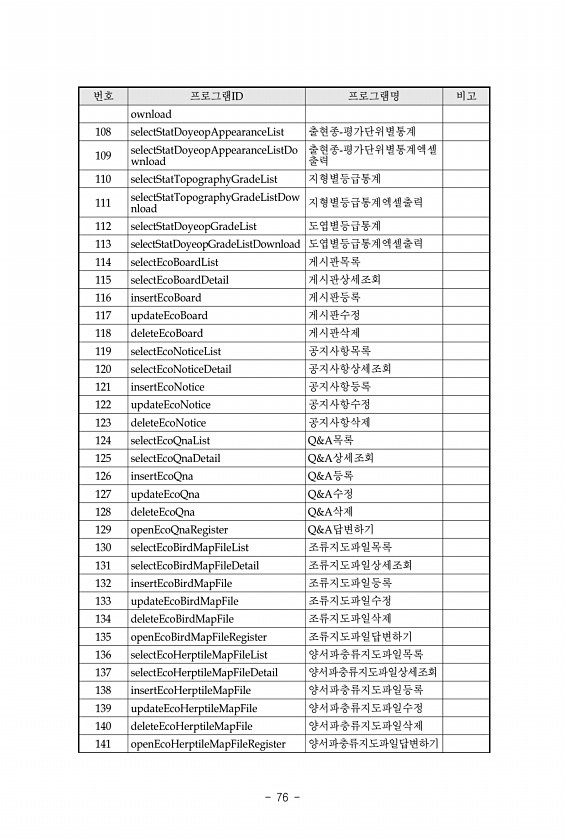 76 번호 프로그램ID 프로그램명 비고 ownload 108 selectStatDoyeopAppearanceList 출현종-평가단위별통계 109 selectStatDoyeopAppearanceListDo wnload 출현종-평가단위별통계엑셀 출력 110 selectStatTopographyGradeList 지형별등급통계 111 selectStatTopographyGradeListDow nload 지형별등급통계엑셀출력 112 selectStatDoyeopGradeList 도엽별등급통계 113 selectStatDoyeopGradeListDownload 도엽별등급통계엑셀출력 114 selectEcoBoardList 게시판목록 115 selectEcoBoardDetail 게시판상세조회 116 insertEcoBo...