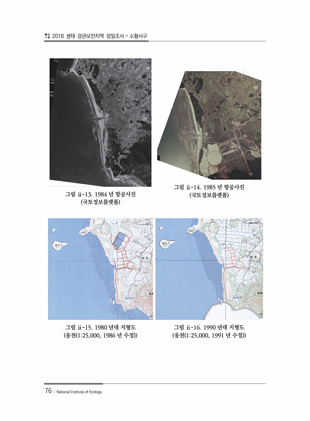 2018 생태·경관보전지역 정밀조사 소황사구 76 ? National Institute of Ecology 그림 ⅱ-13. 1984 년 항공사진 국토정보플랫폼 그림 ⅱ-14. 1985 년 항공사진 국토정보플랫폼 그림 ⅱ-15. 1980 년대 지형도 웅천 125,000, 1986 년 수정 그림 ⅱ-16. 1990 년대 지형도 웅천 125,000, 1991 년 수정