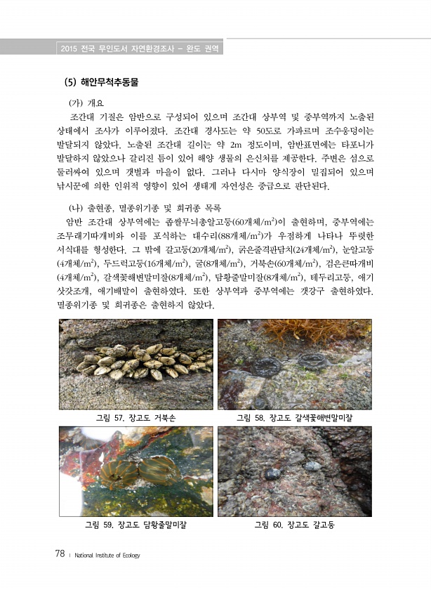 2015 전국 무인도서 자연환경조사 완도 권역 78 ? National Institute of Ecology 5 해안무척추동물 가 개요 조간대 기질은 암반으로 구성되어 있으며 조간대 상부역 및 중부역까지 노출된 상태에서 조사가 이루어졌다. 조간대 경사도는 약 50도로 가파르며 조수웅덩이는 발달되지 않았다. 노출된 조간대 길이는 약 2m 정도이며, 암반표면에는 타포니가 발달하지 않았으나 갈리진 틈이 있어 해양 생물의 은신처를 제공한다. 주변은 섬으로 둘러싸여 있으며 갯벌과 마을이 없다. 그러나 다시마 양식장이 밀집되어 있으며 낚시꾼에 의한 인위적 영향이 있어 생태계 자연성은 중급으로 판단된다. 나 출현종, 멸종위기종 및 희귀종 목록 암반 조간대 상부역에는 좁쌀무늬총알고둥 60개체/m2 이 출현하며, 중부역에는...