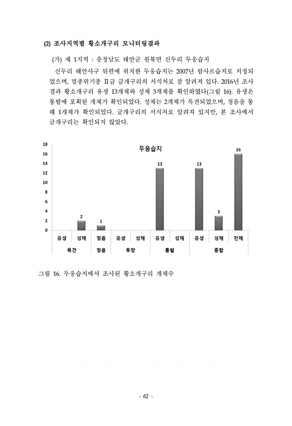 62 2 조사지역별 황소개구리 모니터링결과 가 제 1지역 충청남도 태안군 원북면 신두리 두웅습지 신두리 해안사구 뒤편에 위치한 두웅습지는 2007년 람사르습지로 지정되 었으며, 멸종위기종 Ⅱ급 금개구리의 서식처로 잘 알려져 있다. 2016년 조사 결과 황소개구리 유생 13개체와 성체 3개체를 확인하였다 그림 16 유생은 통발에 포획된 개체가 확인되었다. 성체는 2개체가 목견되었으며, 청음을 통 해 1개체가 확인되었다. 금개구리의 서식처로 알려져 있지만, 본 조사에서 금개구리는 확인되지 않았다. 그림 16. 두웅습지에서 조사된 황소개구리개체수