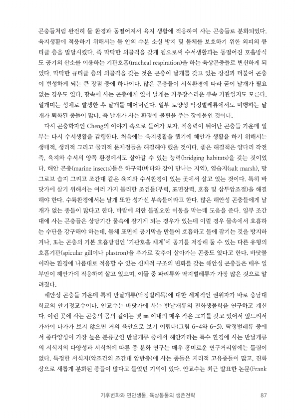 기후변화와 연안생물, 육상동물의 생존전략 87 곤충들처럼 완전히 물 환경과 동떨어져서 육지 생활에 적응하여 사는 곤충들로 분화되었다. 육지생활에 적응하기 위해서는 몸 안의 수분 소실 방지 및 몸체를 보호하기 위한 외피의 큐 티클 층을 발달시켰다. 즉 딱딱한 외골격을 갖게 됨으로써 수서생활과는 동떨어진 호흡방식 도 공기의 산소를 이용하는 기관호흡 tracheal respiration 을 하는 육상곤충들로 변신하게 되 었다. 딱딱한 큐티클 층의 외골격을 갖는 것은 곤충이 날개를 갖고 있는 장점과 더불어 곤충 이 번성하게 되는 큰 장점 중에 하나이다. 많은 곤충들이 서식환경에 따라 굳이 날개가 필요 없는 경우도 있다. 땅속에 사는 곤충에게 있어 날개는 거추장스러운 부속 기관일지도 모른다. 일개미는 성체로 발생한 ...
