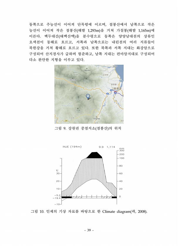 39 동쪽으로 주능선이 이어져 단목령에 이르며, 점봉산에서 남쪽으로 작은 능선이 이어져 작은 점봉산 해발 1,293m 을 거쳐 가칠봉 해발 1,165m 에 이른다. 백두대간 태백산맥 을 분수령으로 동쪽은 양양남대천의 상류인 오색천이 동해로 흐르고, 서쪽과 남쪽으로는 내린천의 여러 지류들이 북한강을 거쳐 황해로 흐르고 있다. 또한 북쪽과 서쪽 지대는 화강암으로 구성되어 산지경사가 급하며 험준하고, 남쪽 지대는 편마암지대로 구성되어 다소 완만한 지형을 이루고 있다. 그림 9. 강원권 중점지소 점봉산 의 위치 그림 10. 인제의 기상 자료를 바탕으로 한 Climate diagram 곽, 2008