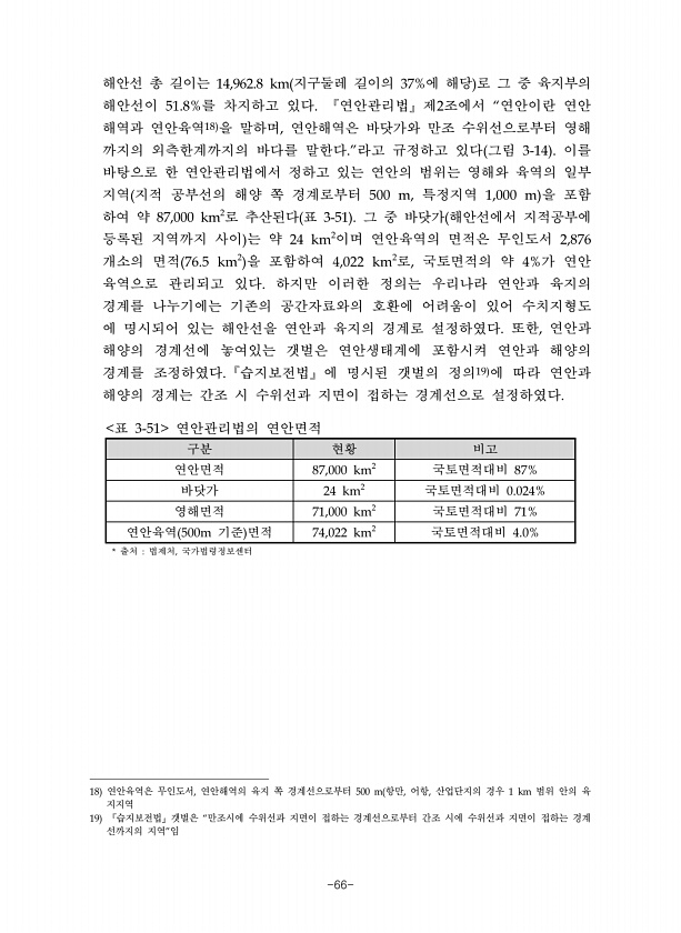 -66- 해안선 총 길이는 지구둘레 길이의 에 해당 로 그 중 육지부의 해안선이 를 차지하고 있다 연안관리법 제 조에서 연안이란 연안 해역과 연안육역 을 말하며 연안해역은 바닷가와 만조 수위선으로부터 영해 까지의 외측한계까지의 바다를 말한다 라고 규정하고 있다 그림 이를 바탕으로 한 연안관리법에서 정하고 있는 연안의 범위는 영해와 육역의 일부 지역 지적 공부선의 해양 쪽 경계로부터 특정지역 을 포함 하여 약 로 추산된다 표 그 중 바닷가 해안선에서 지적공부에 등록된 지역까지 사이 는 약 이며 연안육역의 면적은 무인도서 개소의 면적 을 포함하여 로 국토면적의 약 가 연안 육역으로 관리되고 있다 하지만 이러한 정의는 우리나라 연안과 육지의 경계를 나누기에는 기존의 공간자료와의 호환에 어려움이 있어 수치지형도 에...